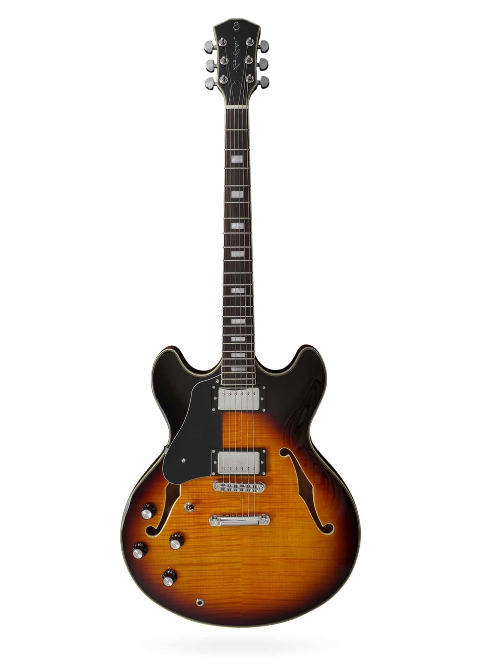 H7 VS Corps en Erable massif flammé – Dos et Eclisse Erable, Format: Semi-Hollow gauchère, manche acajou, forme en C, diapason: 24’75”, touche en ébene (Radius : 12″), Frets: 2,7 medium Jumbo, sillet: 43mm, Binding : Ivoire , Incrustations nacrées, capteurs 2 Humbucker chromés (Alnico2), Contrôles : 2 Volumes, 2 Tonalités (Chaque micro) levier 3 voies, Chevalet : Tune-O-matic & cordier en aluminium, Mécanique: Premium (Chrome), Finition Vintage Sunburst.