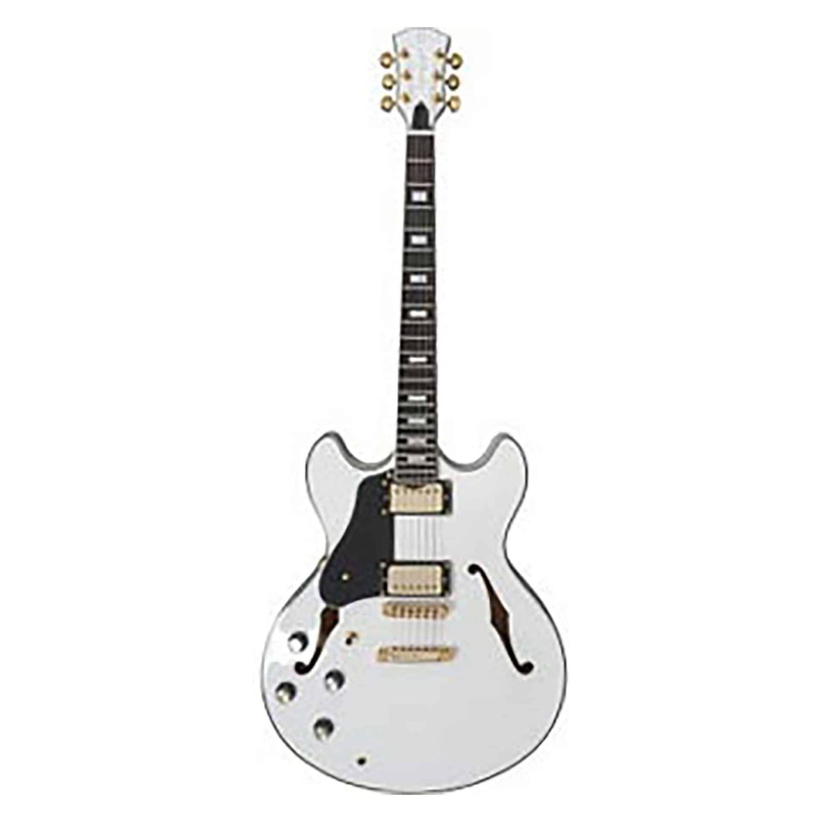 H7 WH Corps en Erable massif flamé – eclisse et dos erable, Format: Semi-Hollow gauchère, manche acajou, forme en C, diapason: 24’75”, touche en ébene (Radius : 12″), Frets: 2,7 medium Jumbo, sillet: 43mm, Binding : Ivoire , Incrustations nacrées, capteurs 2 Humbucker chromés (Alnico2), Pré-ampli: 2 micros double bobinage, Contrôles : 2 Volumes, 2 Tonalités (Chaque micro) levier 3 voies, Chevalet : Tune-O-matic & cordier en aluminium, Mécanique: Capot haute qualité (Chrome), Finition Blanc