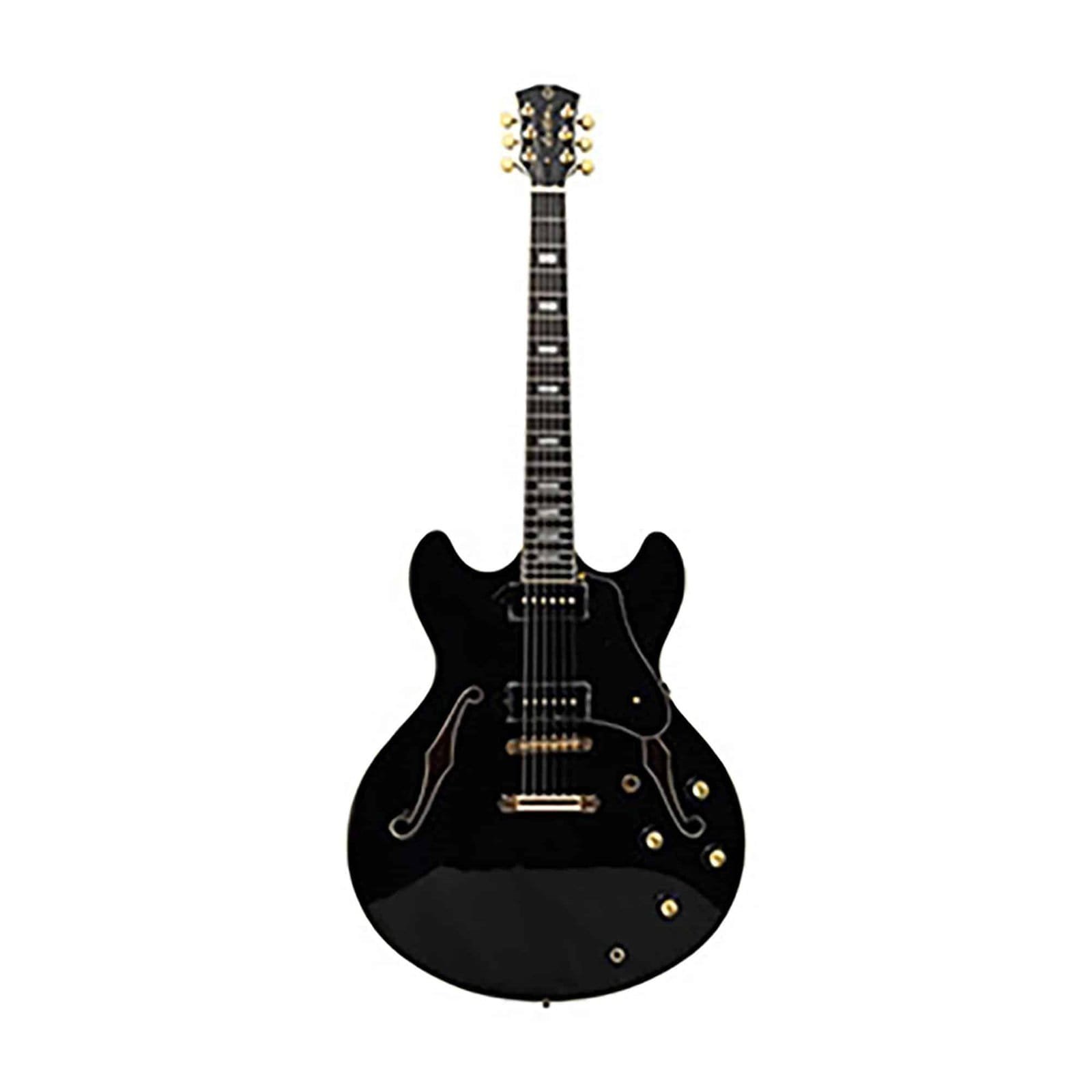 H7V BK Corps en Erable massif flammé – Dos et Eclisse Erable, Format: Semi-Hollow, manche acajou, forme en C, diapason: 24’75”, touche en ébene (Radius : 12″), Frets: 2,7 medium Jumbo, sillet: 43mm, Binding : Ivoire , Incrustations nacrées, capteurs 2 P90, Contrôles : 2 Volumes, 2 Tonalités (Chaque micro) levier 3 voies, Chevalet : Tune-O-matic & cordier en aluminium, Mécanique: Capot Premium (Chrome), Finition Noir.