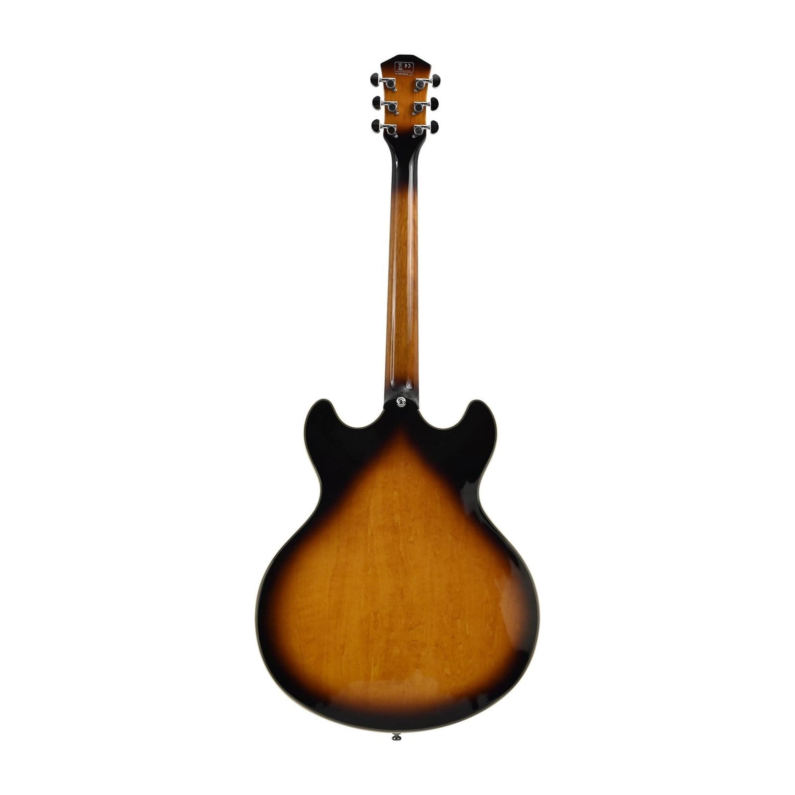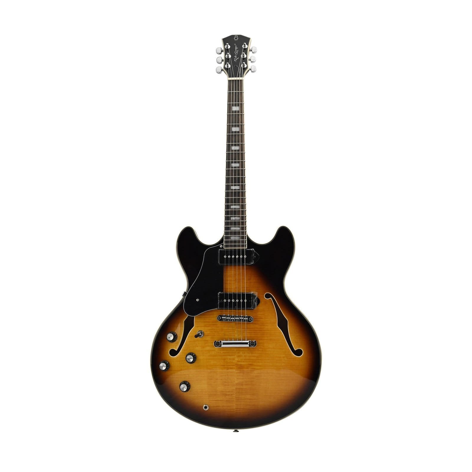 H7V VS Corps en Erable massif flammé – Dos et Eclisse Erable, Format: Semi-Hollow gauchère, manche acajou, forme en C, diapason: 24’75”, touche en ébene (Radius : 12″), Frets: 2,7 medium Jumbo, sillet: 43mm, Binding : Ivoire , Incrustations nacrées, capteurs 2 P90, Contrôles : 2 Volumes, 2 Tonalités (Chaque micro) levier 3 voies, Chevalet : Tune-O-matic & cordier en aluminium, Mécanique: Capot Premium (Chrome), Finition Vintage sunburst.