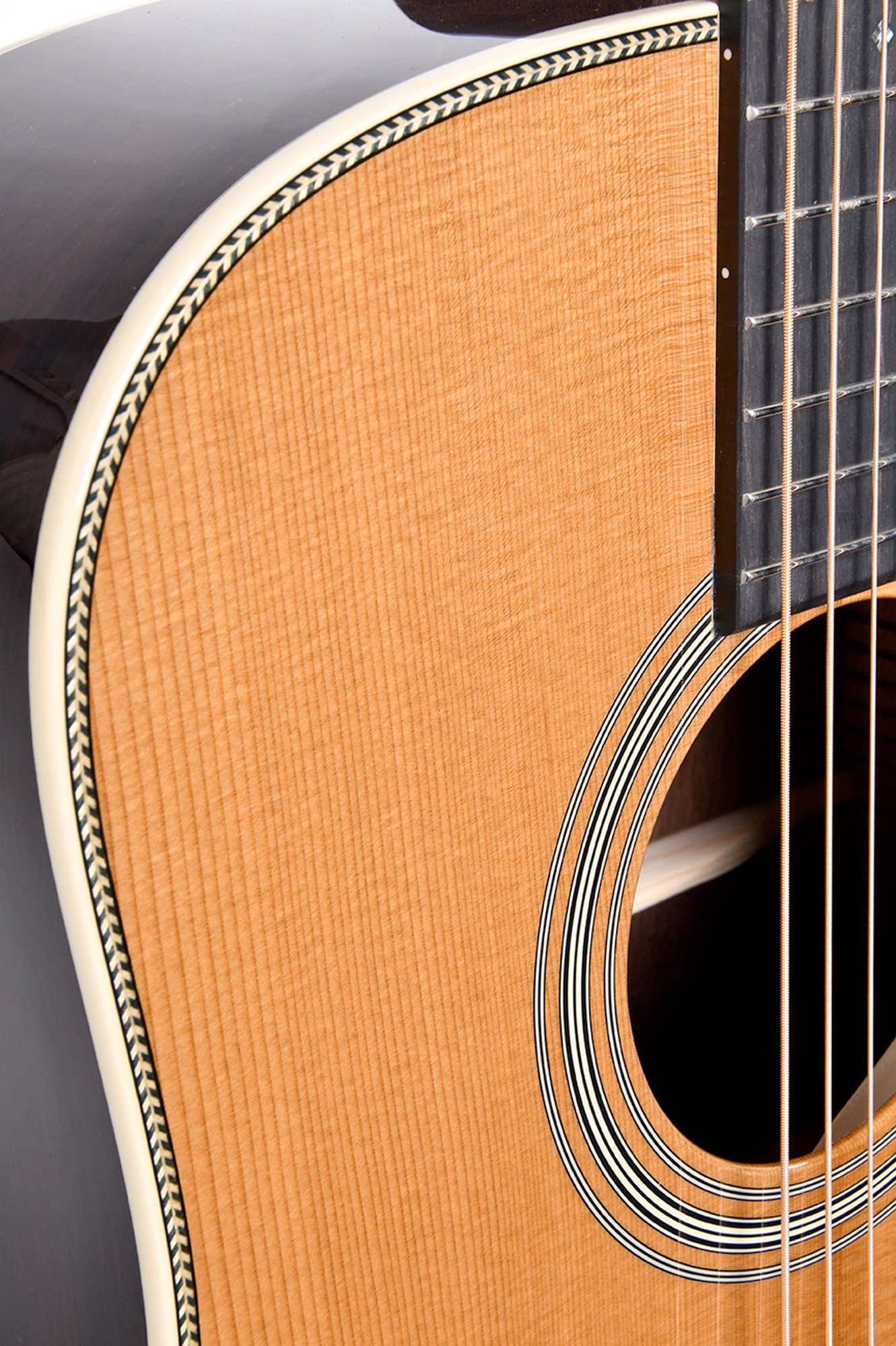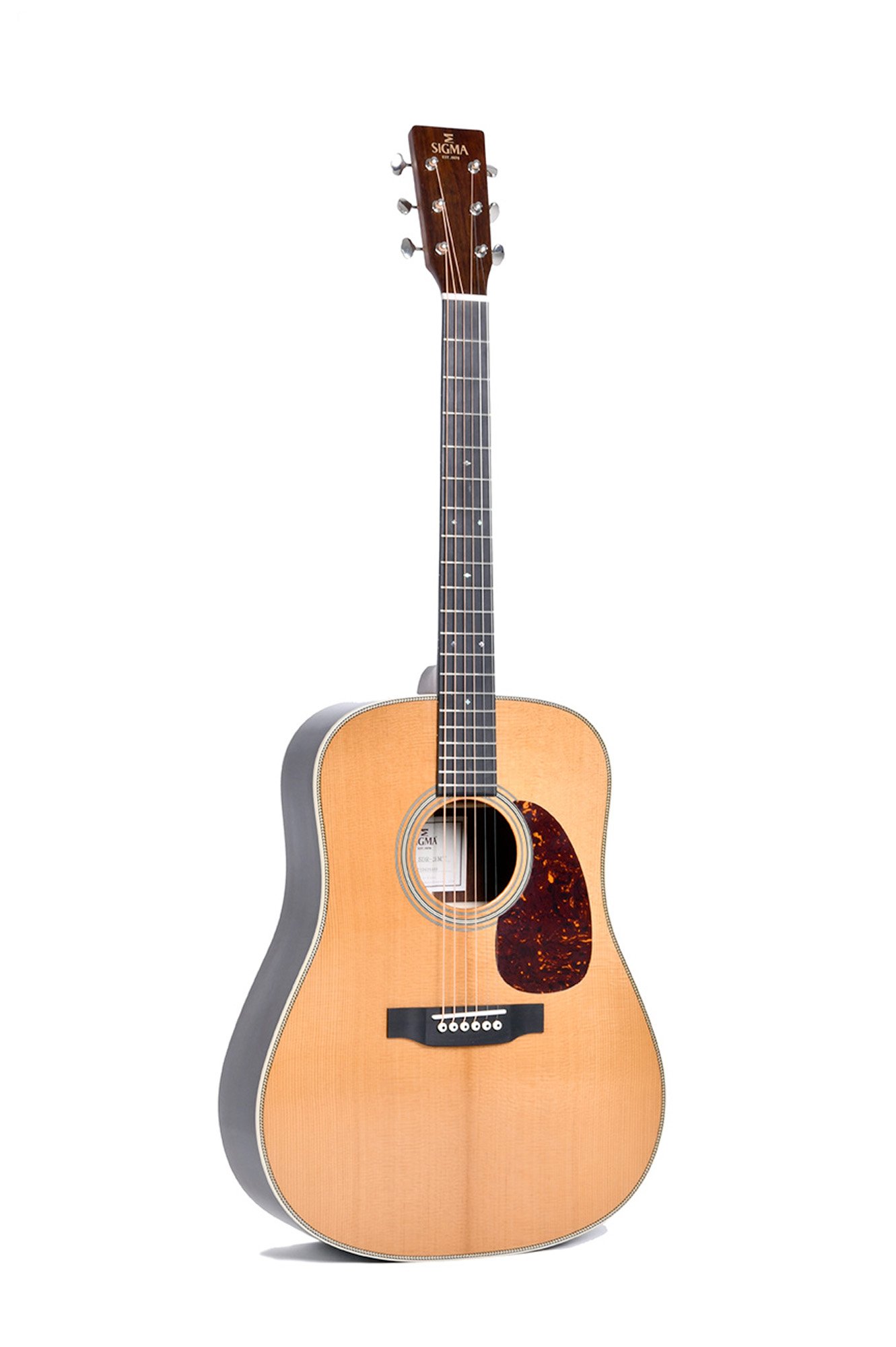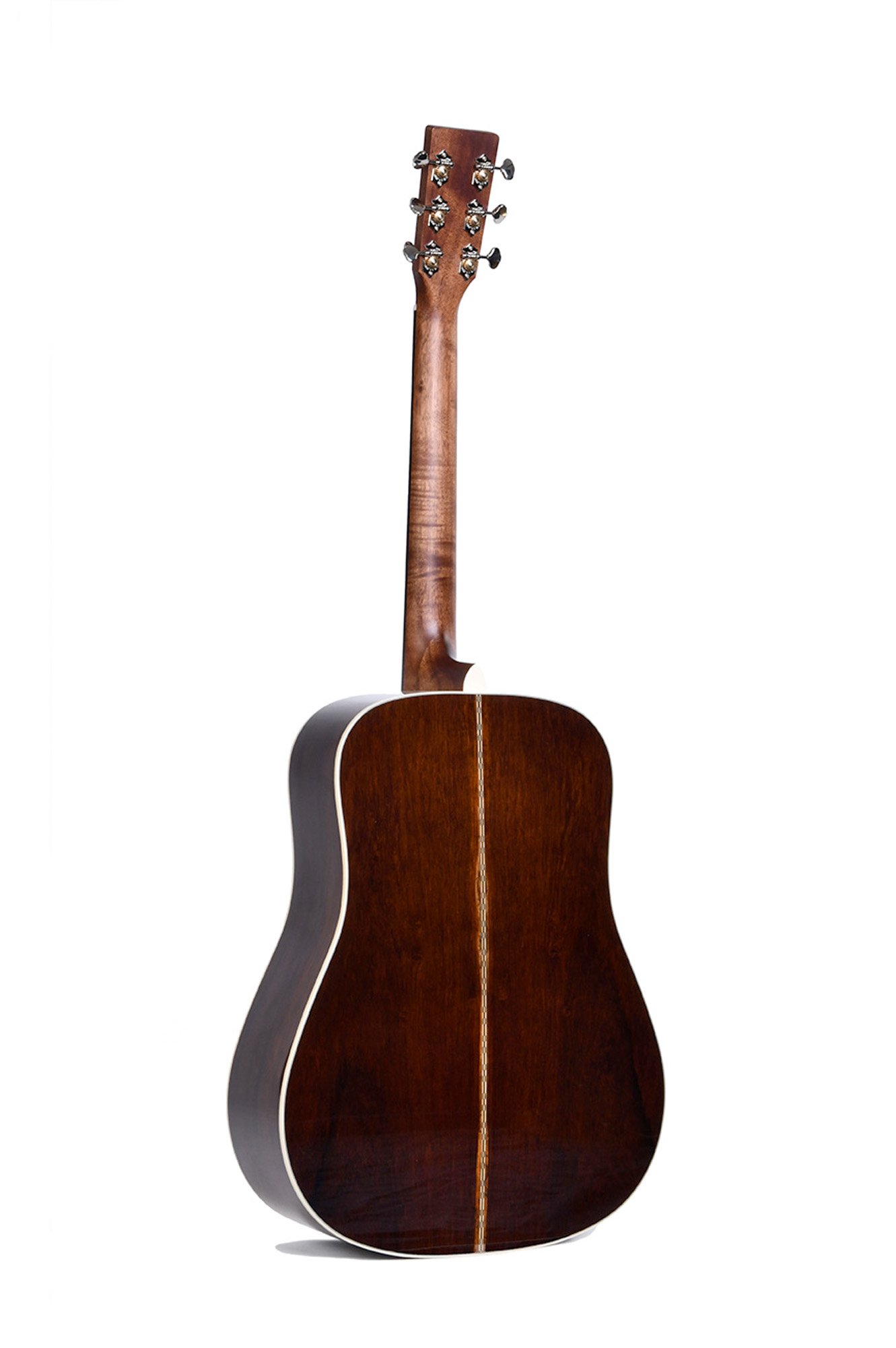 Modèle SDR-28MT, Dreadnought, table épicéa Sitka massif torréfié, fond & éclisses palissandre du madagascar massif, manche acajou, sillets en os, touche & chevalet ébène, diapason 25.4″ (645 mm), largeur au sillet 44.5 mm, mécaniques ouvertes Grover chromées, avec soft case SSC-D.